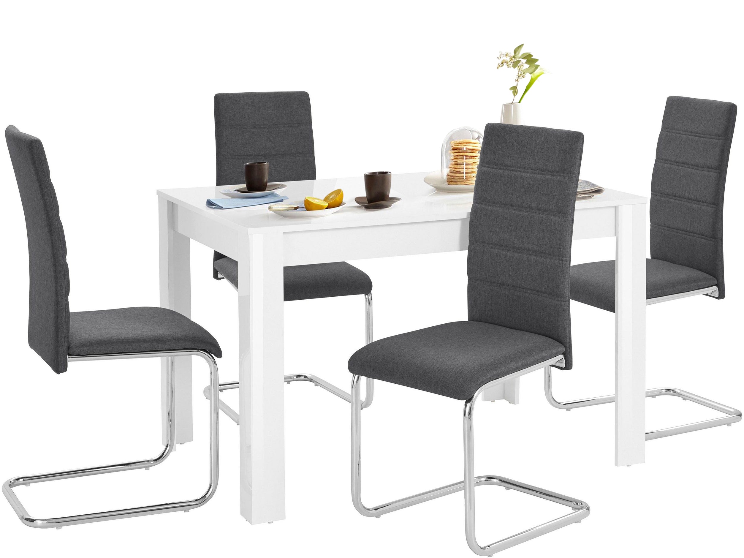 Det moderne og stilfulde spisebordssæt inkluderer et smart bord i højglans-look samt attraktive udkragningsstole med kromstel. Med sine dimensioner byder spisebordet på masser af plads til flere personer. Den er lavet af FSC-certificeret® træbaseret materiale. Stolene af træstof imponerer med deres flotte quiltning på ryglænet.