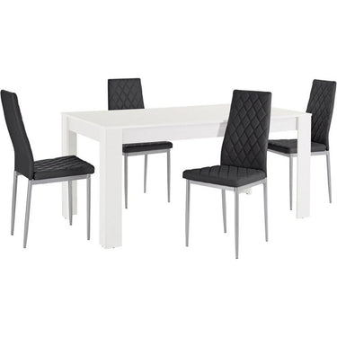 Det nye center i din spisestue, hvor du kan samle dine kære. Med dette 5-delte spisebordssæt med en firkantet bordplade og fire komfortable spisestuestole fås i forskellige farver og bordstørrelser. Det rektangulære spisebord imponerer med sit trædesign og de robuste fire bordben. Stolenes designmæssige højdepunkter inkluderer den diamantformede quiltning, der pryder ryglænene. Et FSC®-certificeret træbaseret materiale blev brugt til at fremstille bordplader, der fås i en blanding af stilarter.
