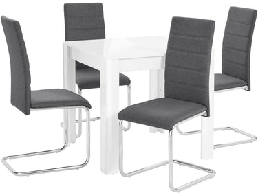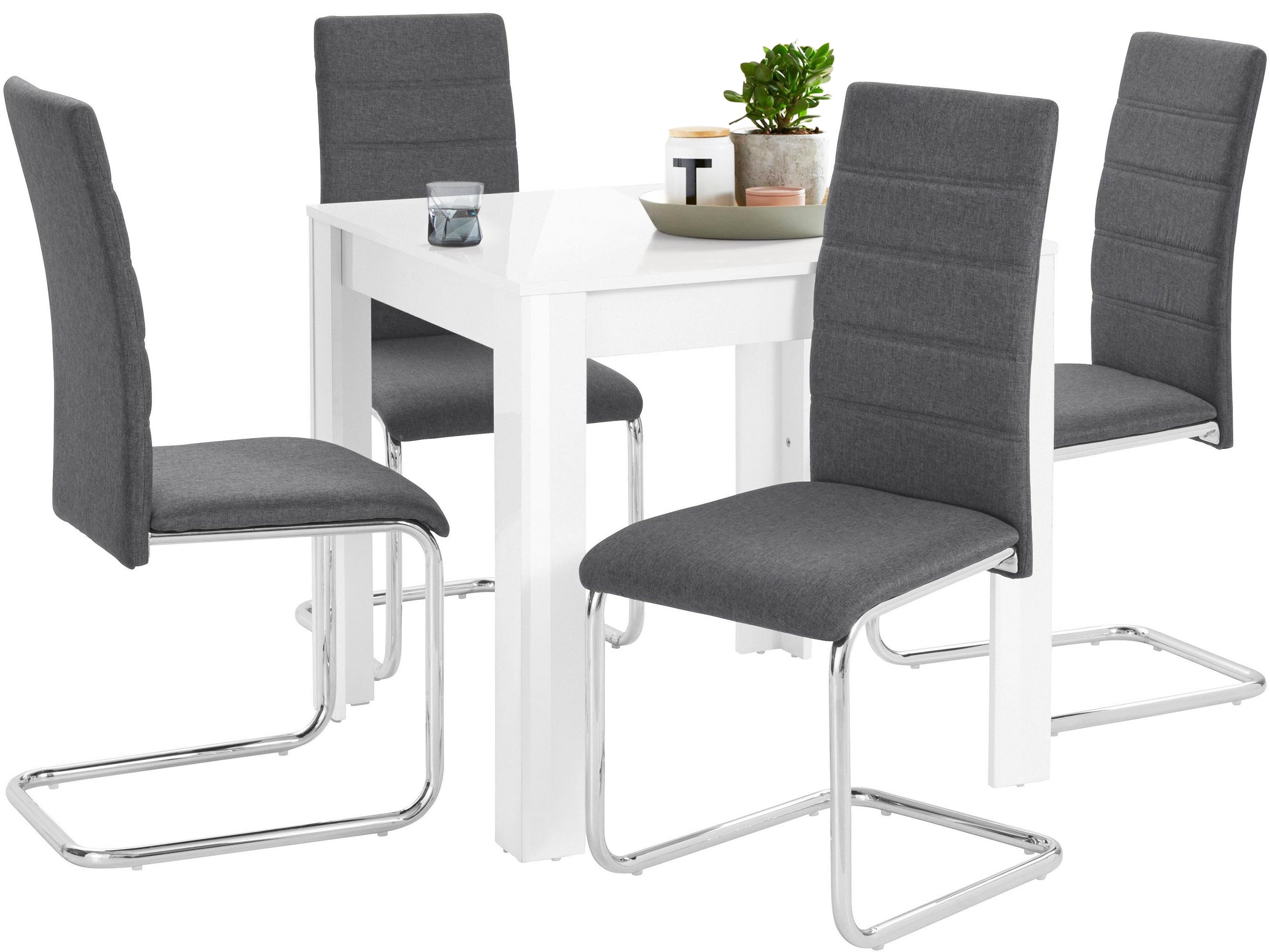 Det moderne og stilfulde spisebordssæt inkluderer et smart bord i højglans-look samt attraktive udkragningsstole med kromstel. Med sine dimensioner byder spisebordet på masser af plads til flere personer. Den er lavet af FSC-certificeret® træbaseret materiale. Stolene af træstof imponerer med deres flotte quiltning på ryglænet.