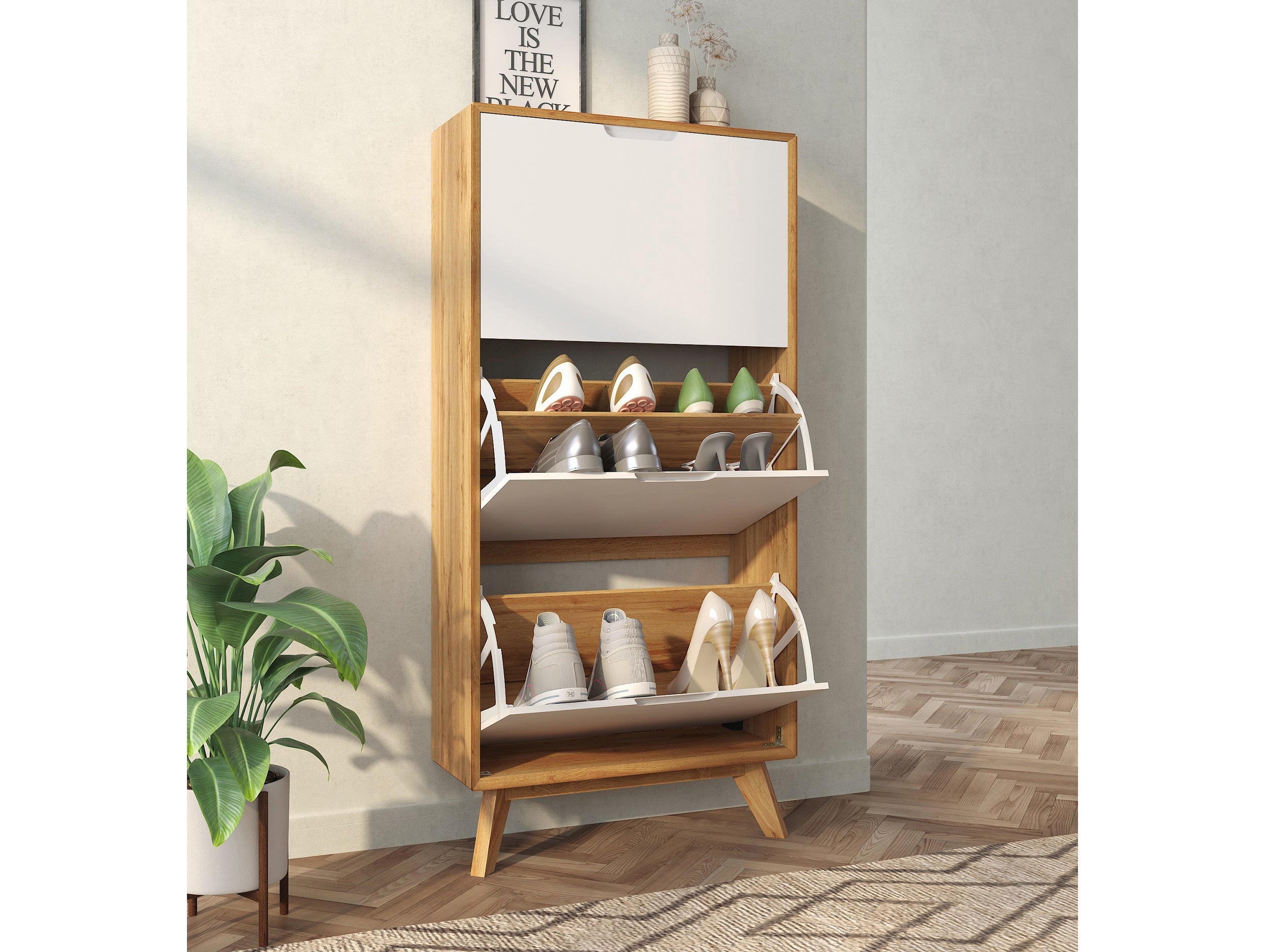 Dette stående skoskab giver dig ekstra opbevaringsplads, hvor du kan holde dine sko godt beskyttet. Skabet med tre klapper er stort set lavet af stabilt træmateriale og er derfor overbevisende med sin solide robusthed. Kan læsses med op til 20 kg. Skoskrinet tilføjer et strejf af skandinavisk livsstil til dit hjem.