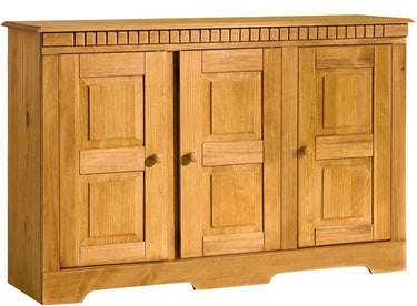 Trædesign med talrige detaljer, skænken imponerer med sine mange små specielle funktioner og det vellykkede håndværk. Det FSC®-certificerede fyrretræ i kombination med de enkelte årer understreger skænkens solide indtryk. Affladede kanter elegante hængsler runde dørhåndtag og forskellige dekorative elementer på og i træet fuldender skænkens charme. Bag trælågerne sikrer justerbare hylder orden og masser af justerbar opbevaringsplads. Uanset om det er i gangen i soveværelset, spisestuen eller i stuen, giver denne skænk hvert værelse sit særlige præg.