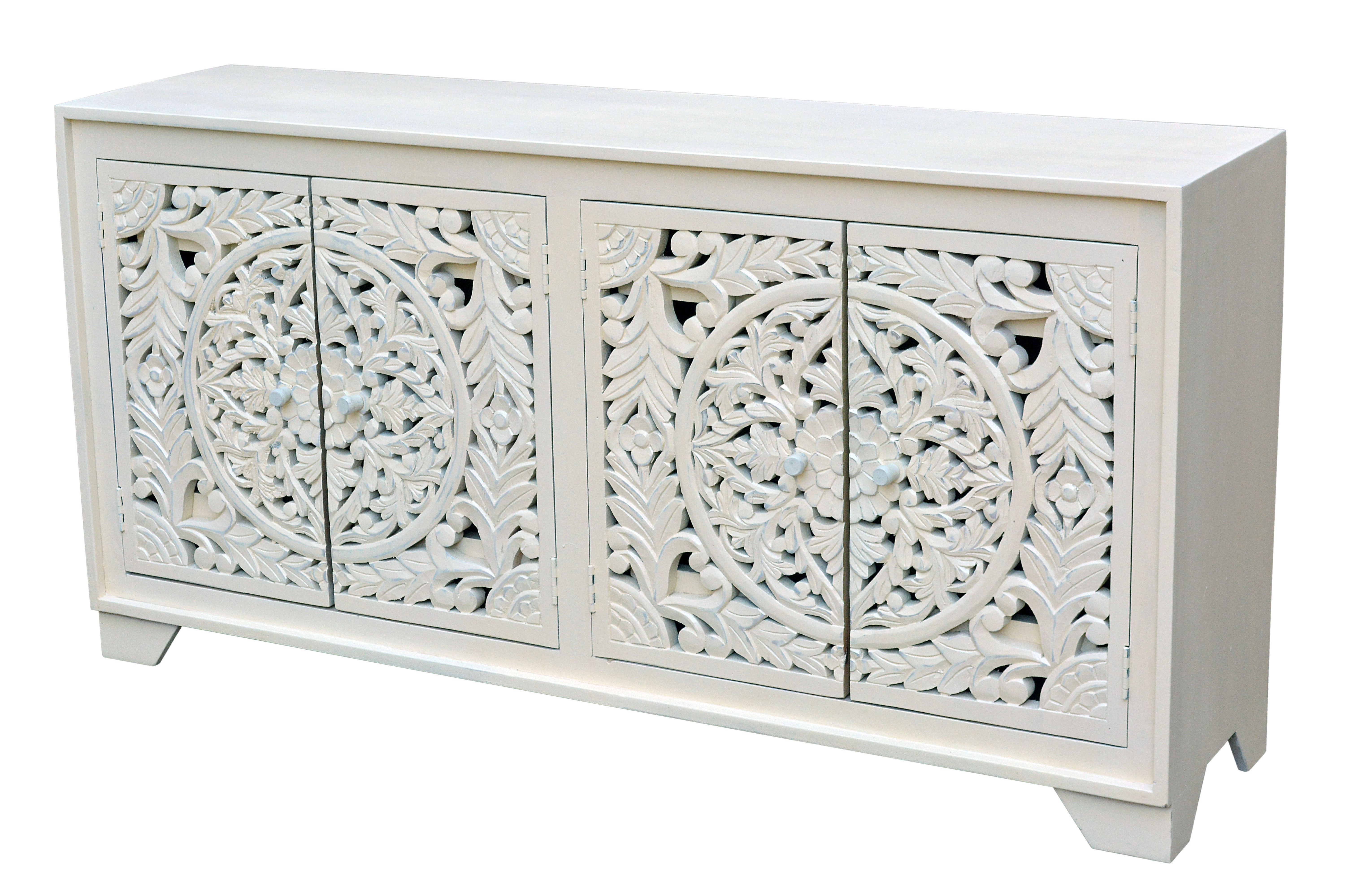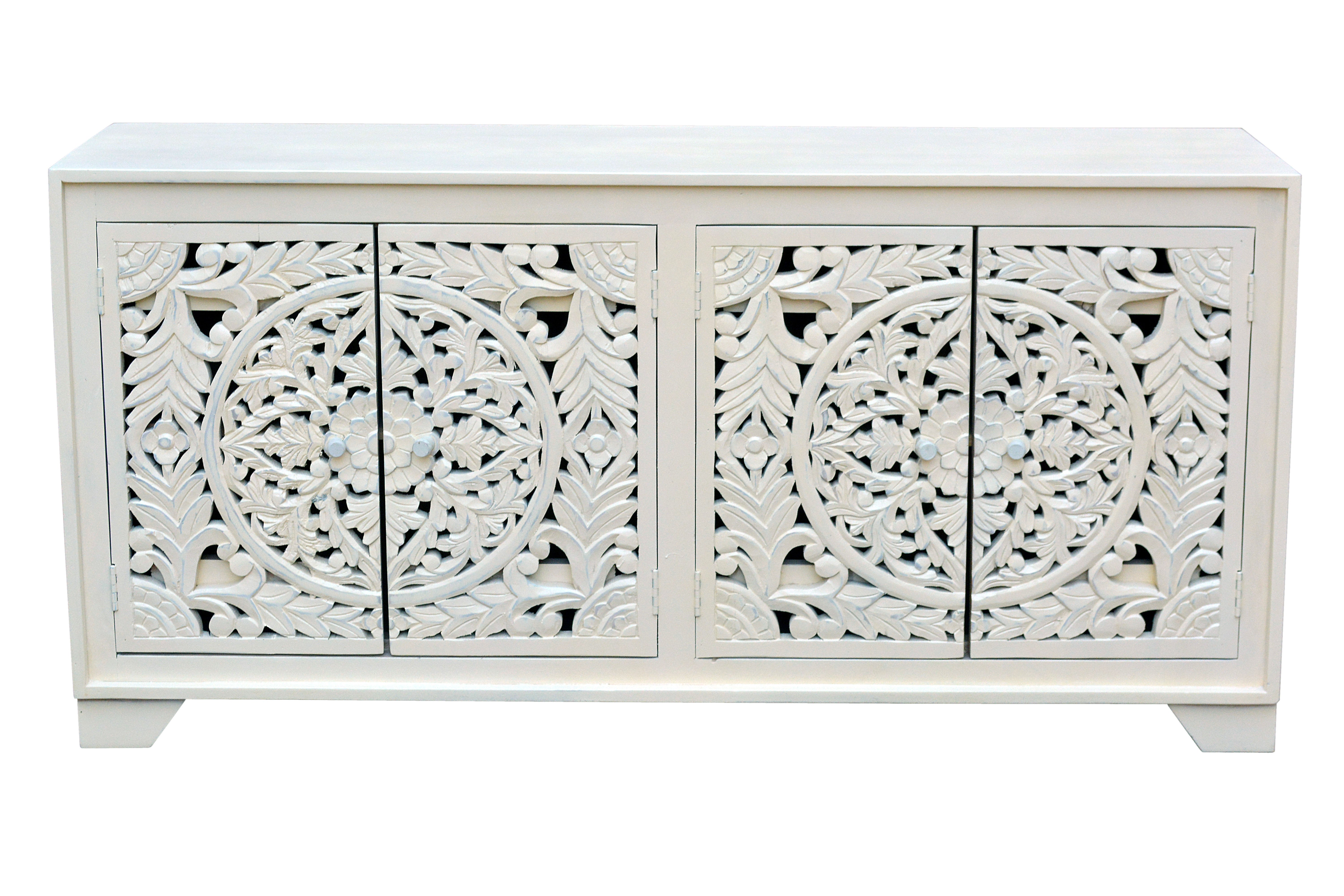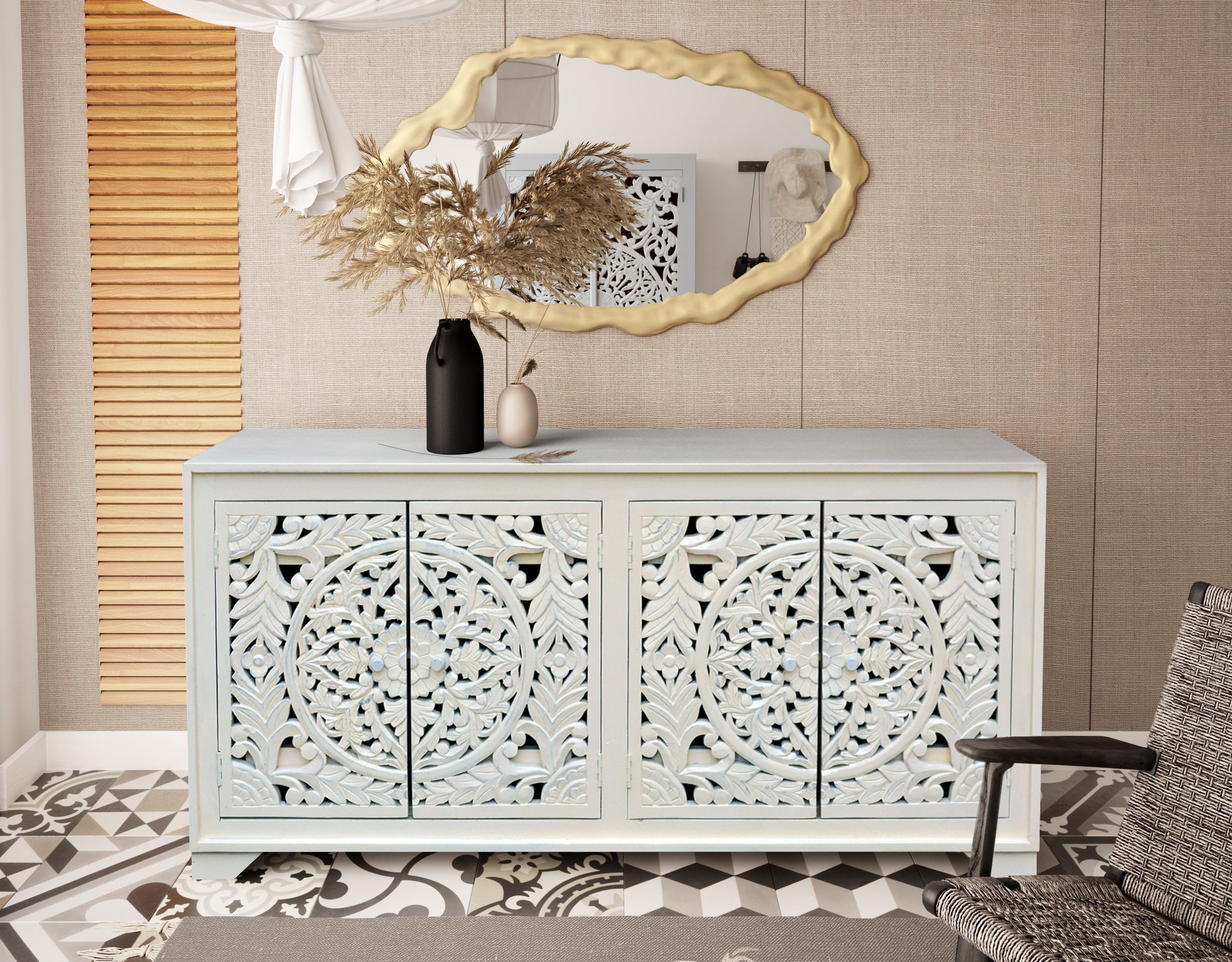 Skænken har fire rummelige døre, hver med dekorative udskæringer i hvid, der tilføjer et strejf af sofistikering og intriger til stykket. Dørene er designet til at give rigelig opbevaringsplads til alle dine væsentlige ting, samtidig med at de holder dem pænt organiseret og ude af syne.