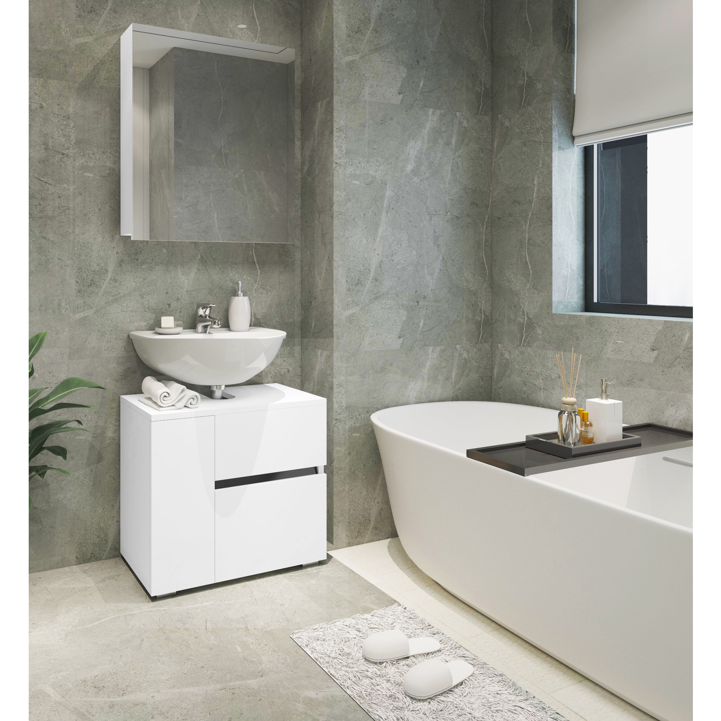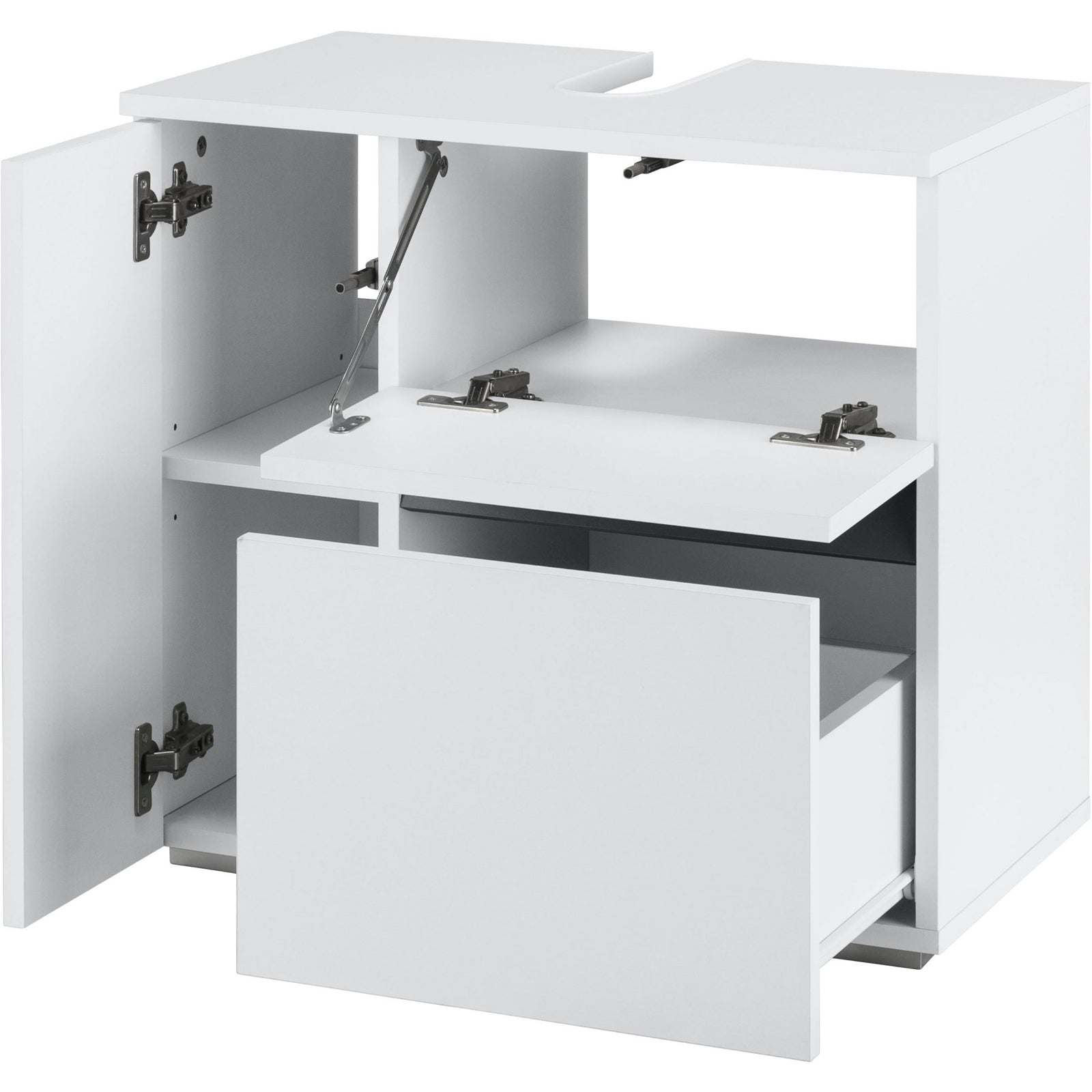 Håndvaskskabet sætter en fin figur i ethvert badeværelse. Bag lågen og klappen samt i den praktiske skuffe finder du opbevaringsplads til dine badeværelsesartikler. Takket være pushtoopen-funktionen kan skabet åbnes uden håndtag. Kvalitetsmæssigt imponerer den med en letpleje overflade.