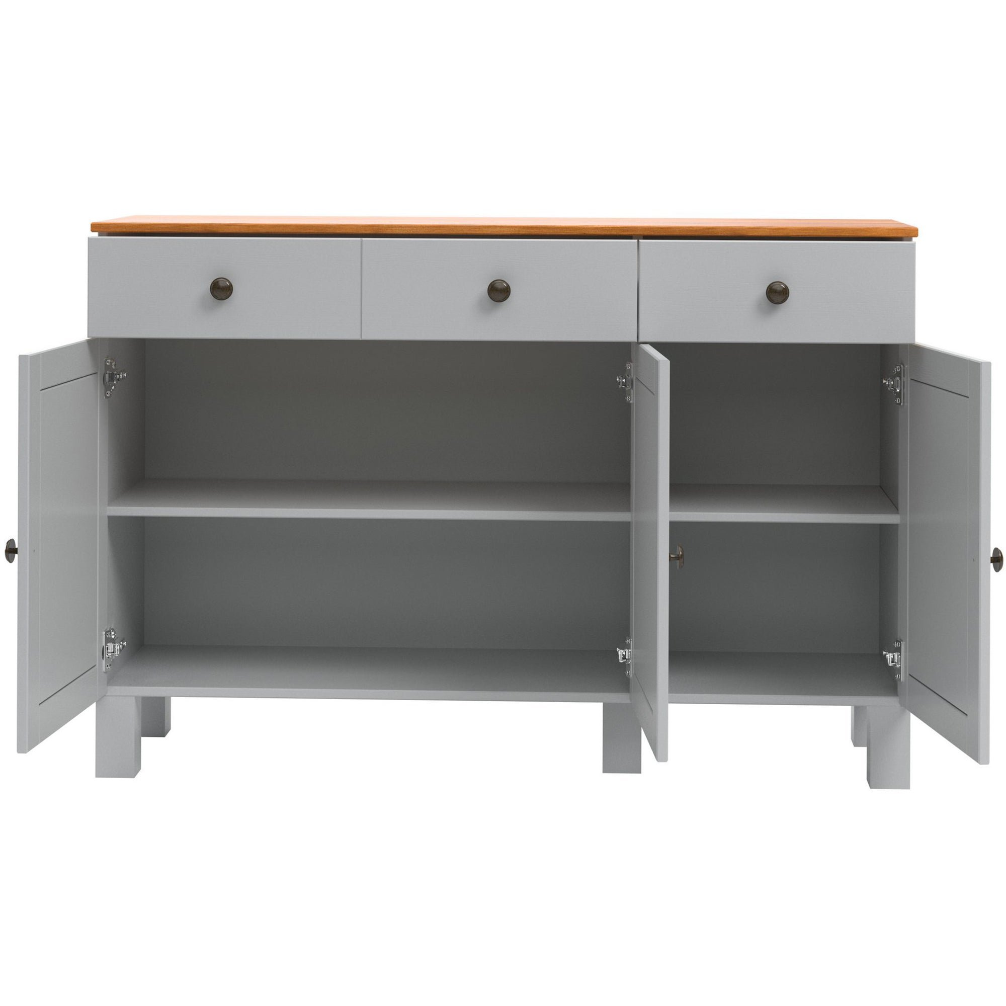 En rummelig og elegant skænk designet til at bringe både stil og funktionalitet til ethvert hjem. Fremstillet af massivt fyrretræ har den et varmt og naturligt udseende, der komplementerer forskellige interiører. Den robuste konstruktion sikrer holdbarhed, hvilket gør den til en praktisk opbevaringsløsning.