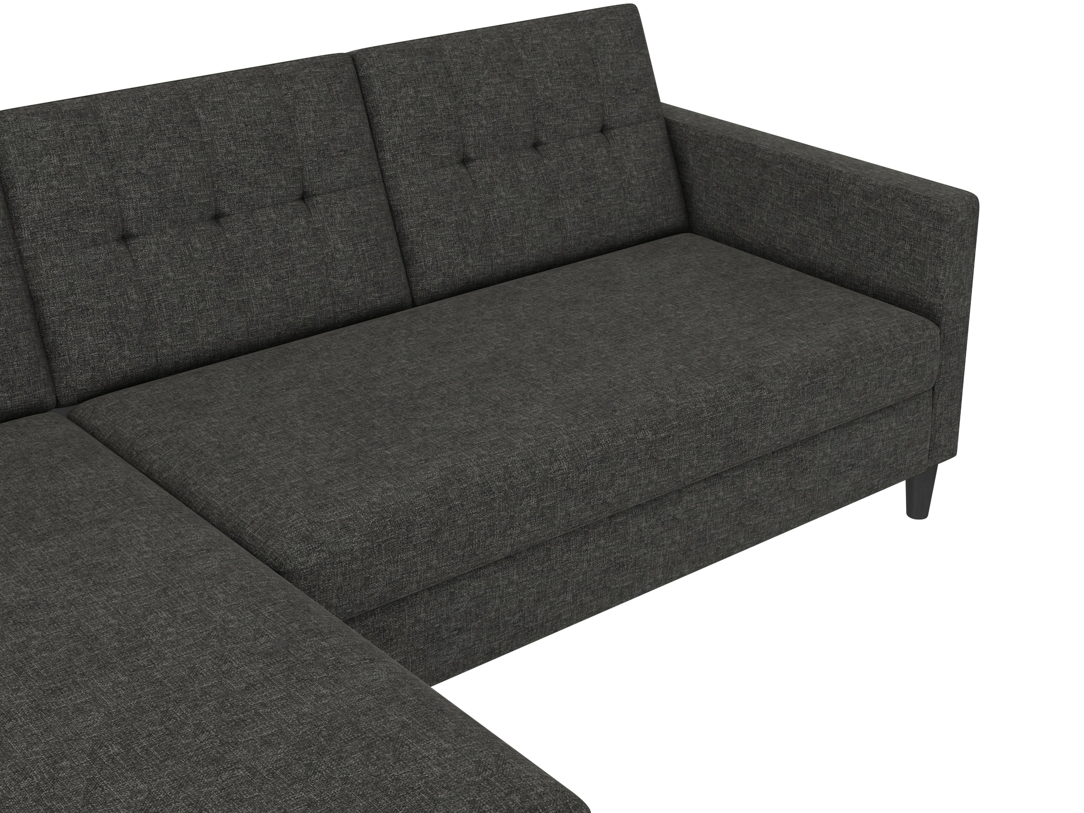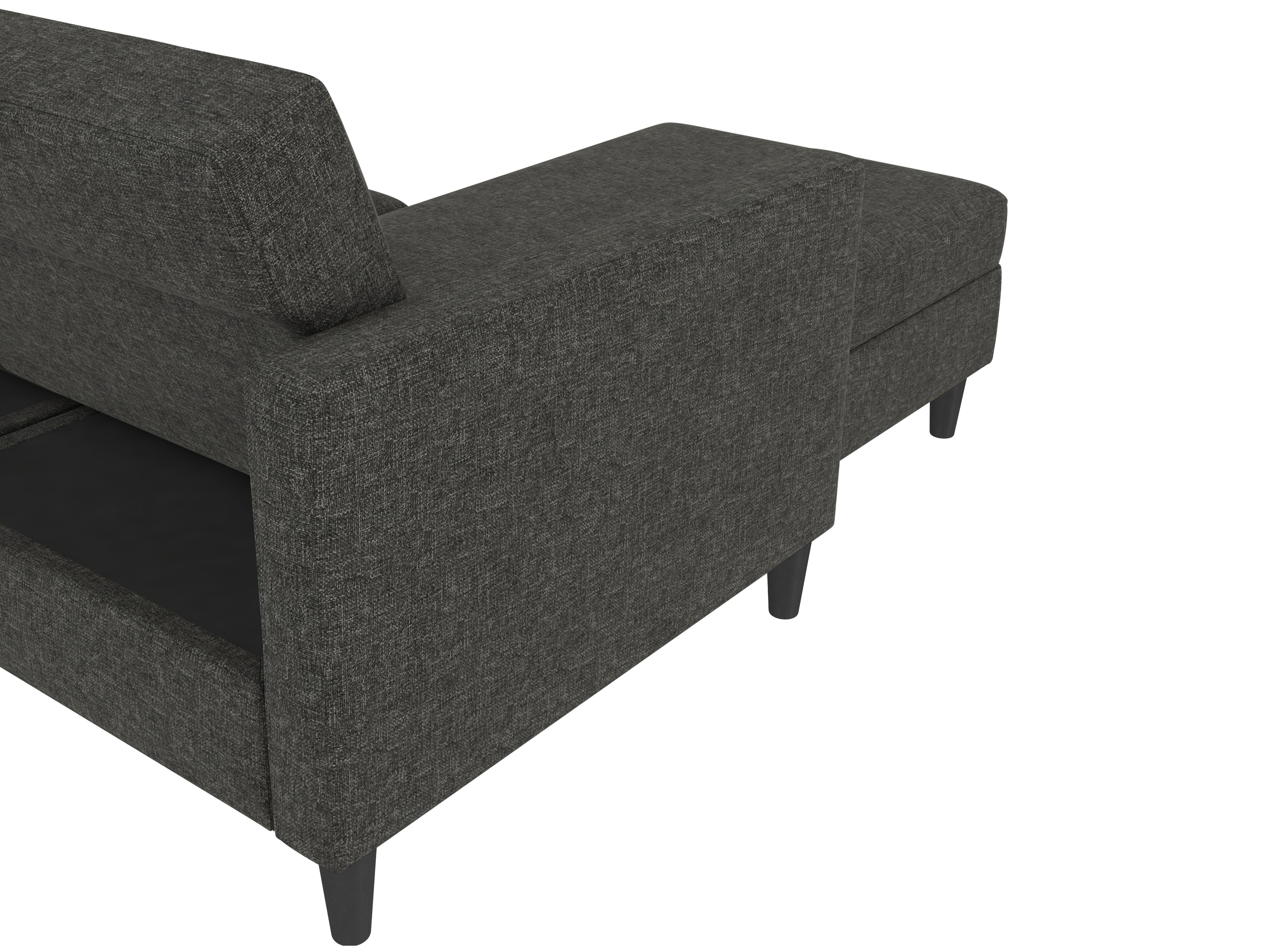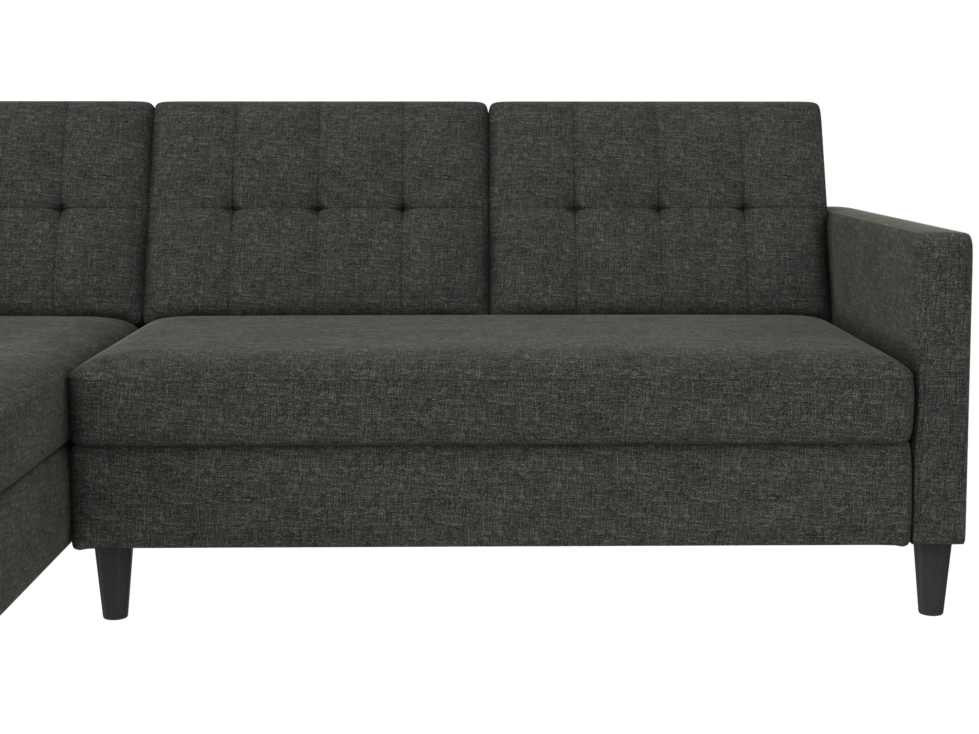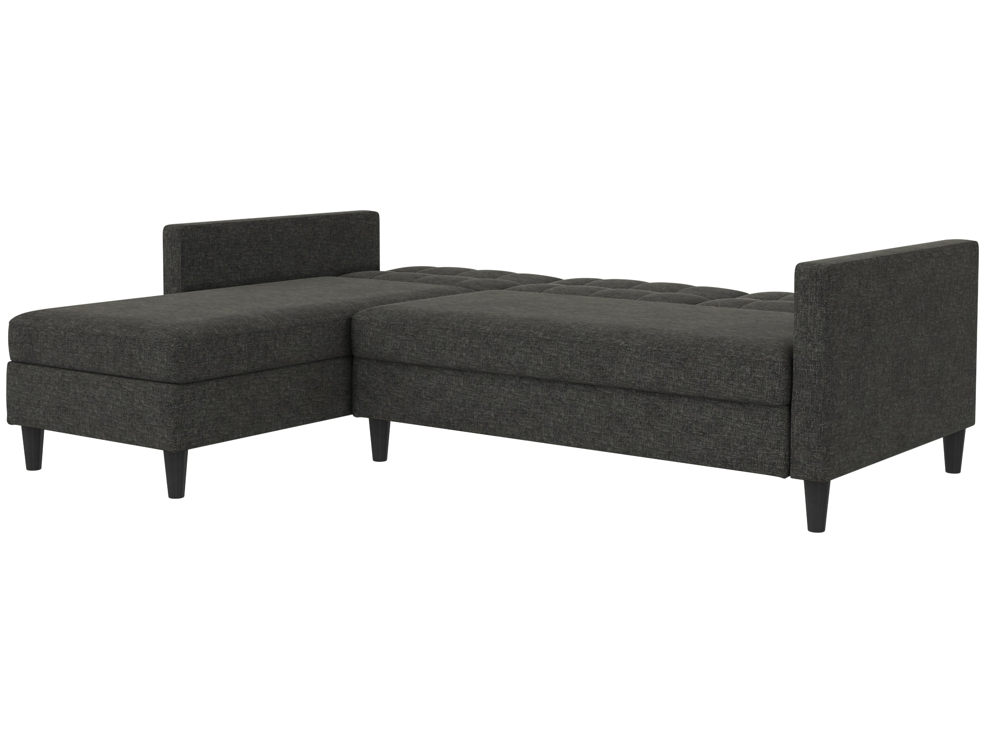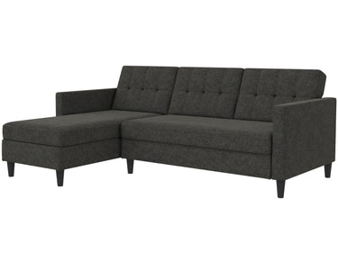 Denne sovesofa har en moderne stil. Det er bygget med konstrueret træ og højkvalitets dækmaterialer. Polstret er fyldt med skum for den rette komfort. Hjørnesofaen har en udtrækbar liggeflade den kan bruges som gæsteseng. Den er manuelt justerbar. Chaiselongen kan åbnes til opbevaring.