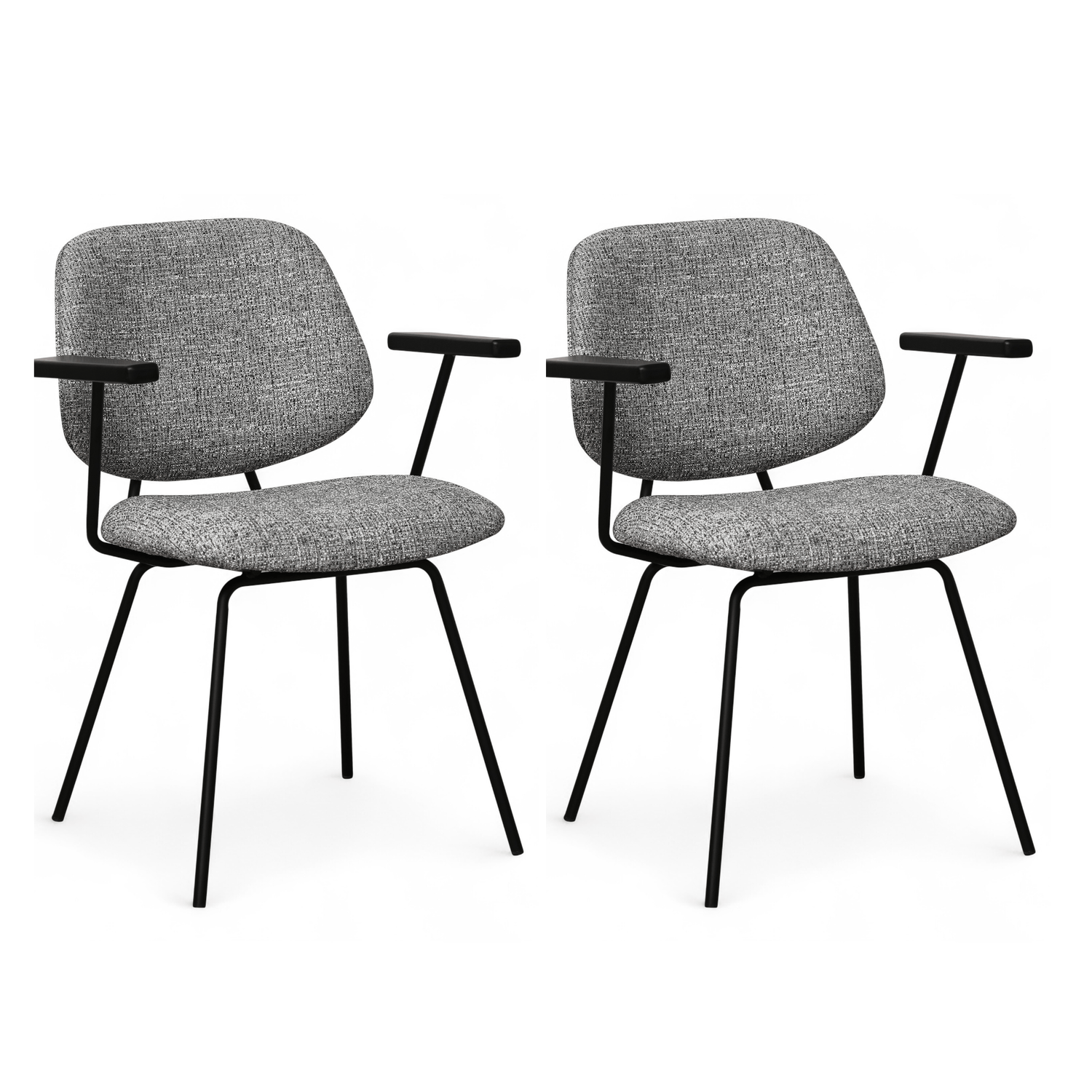 Sofia spisestuestolen med armlæn har et gråt bouclé-stofsæde og ryglæn med skumpolstring. Rammen og benene er lavet af sort metal for stabilitet og et moderne udseende. Armlænene tilføjer støtte og komfort, og designet kombinerer skandinaviske, industrielle og japanske elementer. Polstring er OEKO-TEX® certificeret og testet til daglig brug. Montering påkrævet. Kun indendørs brug.