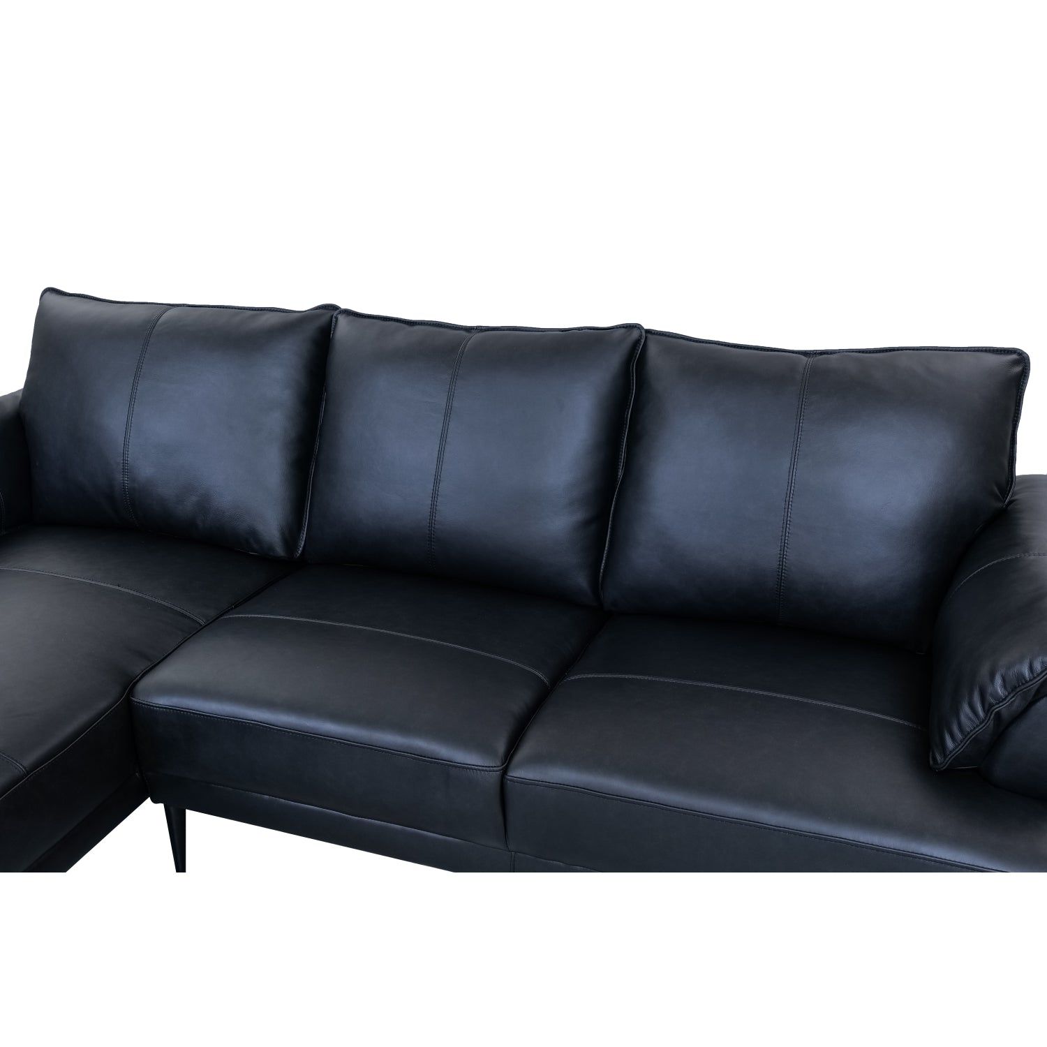 Venstrevendt L-formet sofa betrukket med glat sort 100 % læder for et slankt, minimalistisk look. Den er egnet til op til tre personer og inkluderer sædehynder i skum og pocketfjedre og et PP-fiberfyldt ryglæn. Skumdensitet: 30 kg/m³. Bygget på en robust træ- og metalramme, understøttet af sorte metalben. Chaiselong-siden strækker sig til 155 cm. Sædebredde: 193 cm. Sædehøjde: 45 cm. Samling af ryglæn og ben påkrævet. Kun til indendørs brug. Rengør med en let fugtig klud eller læderpleje.