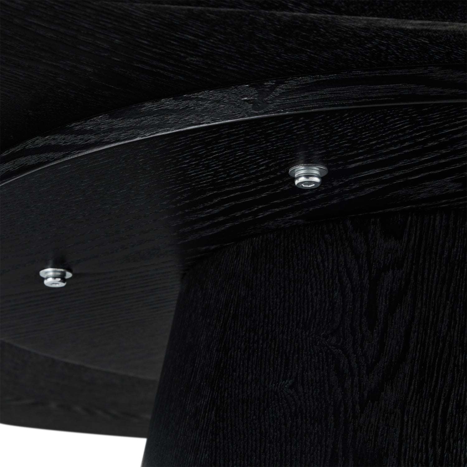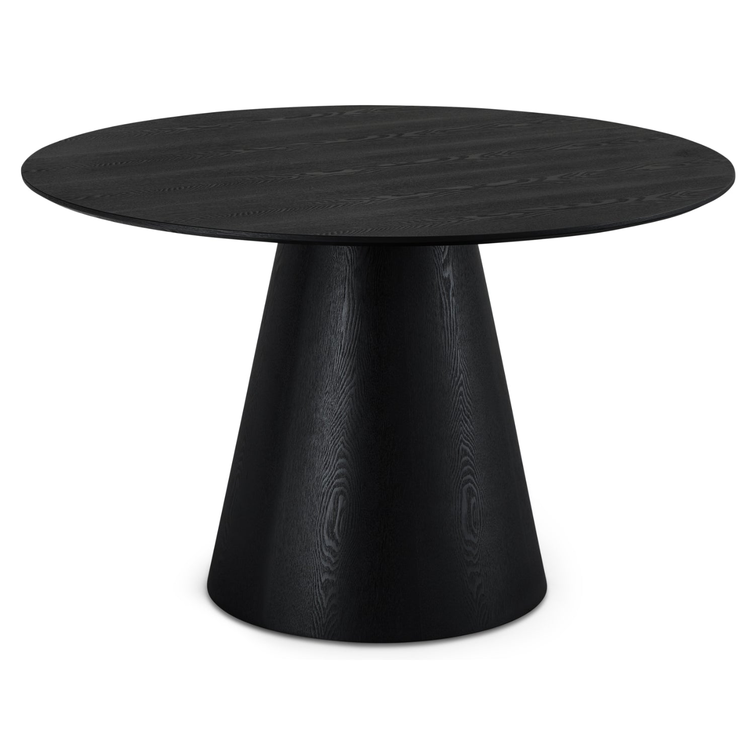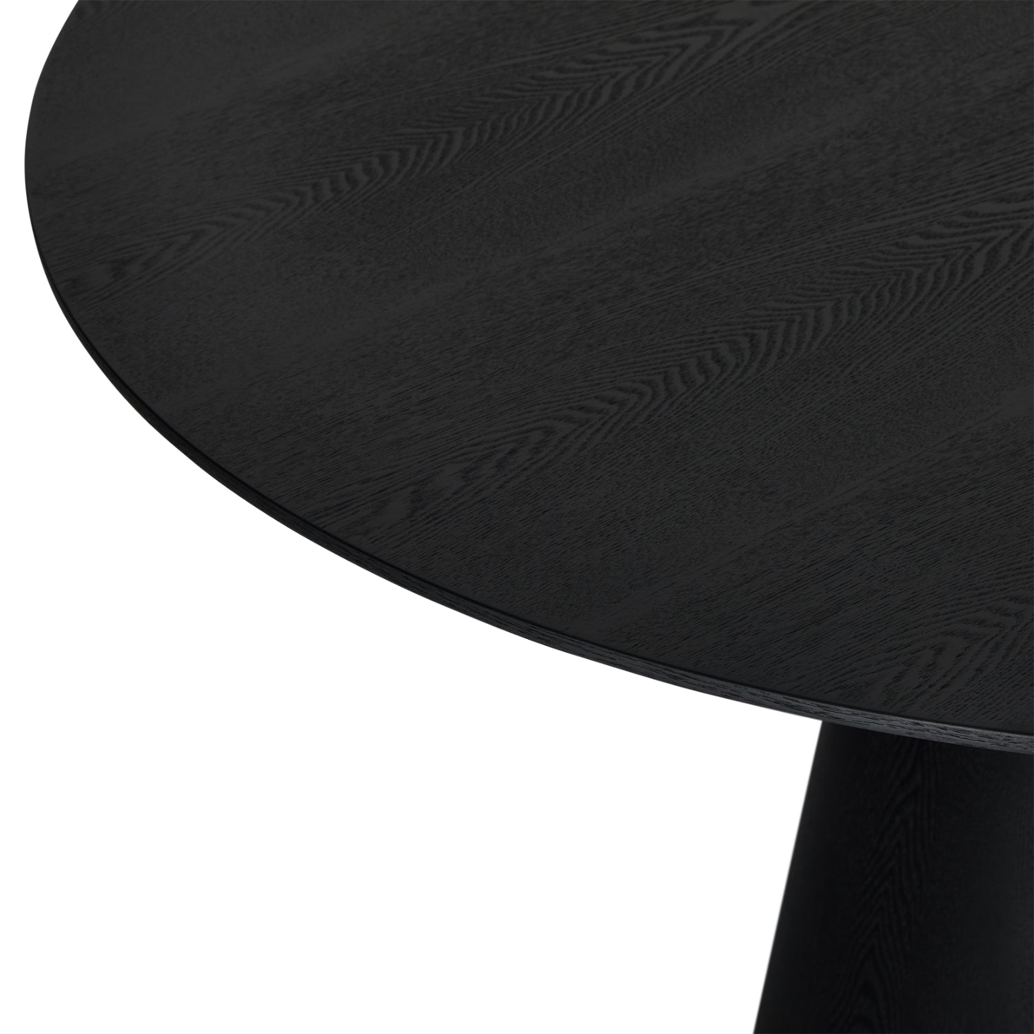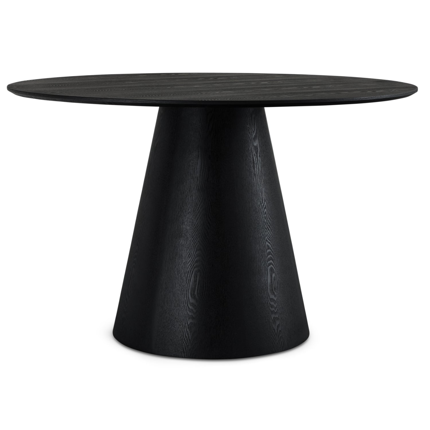 Denne version af Tango runde spisebord har en 120 cm sort egefinerplade med 4 cm tykkelse. Konstrueret af MDF med et matchende centralt ben, er den 76 cm høj og har komfortabel plads til fire. Bordet vejer 63 kg, bærer 30 kg og er FSC® certificeret. Montering påkrævet. Til indendørs brug.