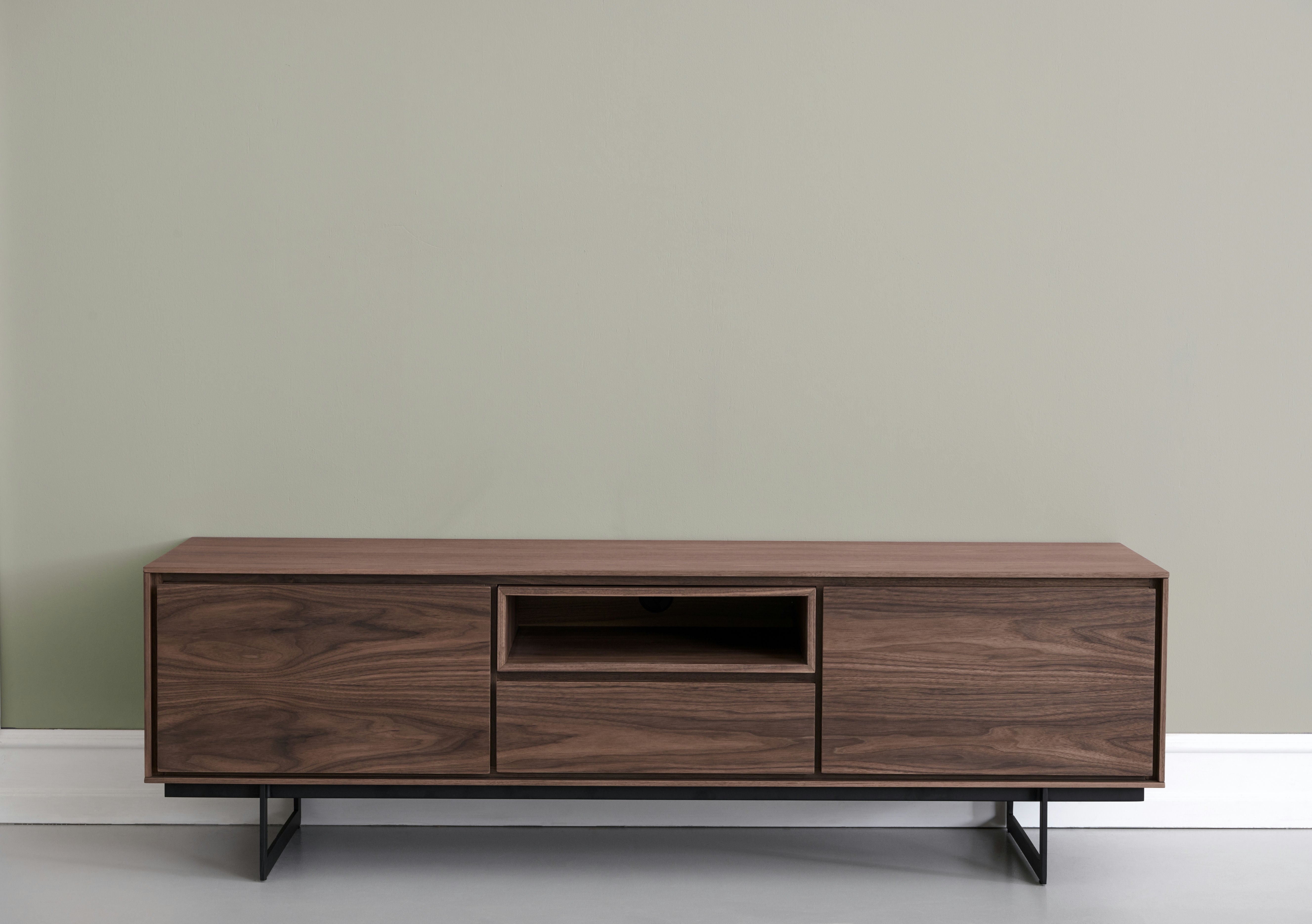 Tv-bord med MDF-hus i amerikansk valnøddefiner og stel af sort metal. To låger, en central skuffe og en åben hylde giver organiseret opbevaring af elektronik og tilbehør. Soft-close system på alle låger og skuffer. Ben: 16 cm høje. Total bredde: 160 cm. Overflade i varm valnødfinish med synlige træårer. Designet til indendørs brug. Samling kun påkrævet for ben.