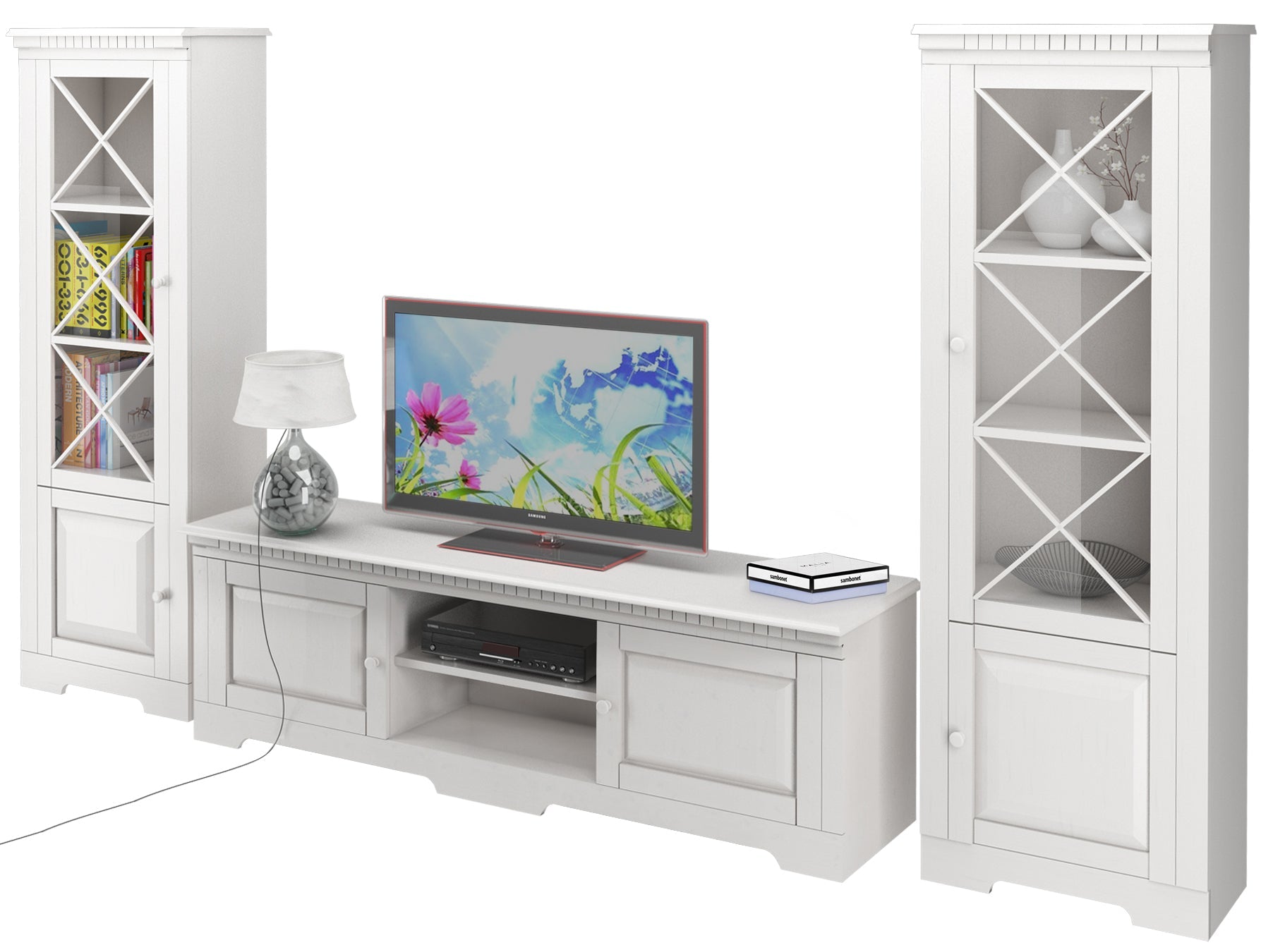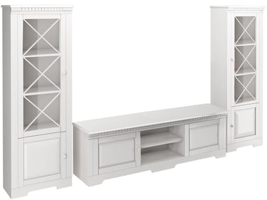 Lisa Wall Unit er et smukt og funktionelt møbel til din stue. Den er lavet af fyrretræ i landlig stil og har et FSC-certifikat, hvilket betyder, at den er lavet af miljøvenligt træ. Vægskabet indeholder to vitrineskabe et på hver side og et lowboard i midten. Vitrineskabene har glaslåger og hylder, hvor du kan fremvise dine yndlingsting. Lowboardet har to trædøre og to åbne hylder, hvor du kan opbevare dine medieenheder. Lisa Wall Unit er en hyggelig og charmerende tilføjelse til din stue.