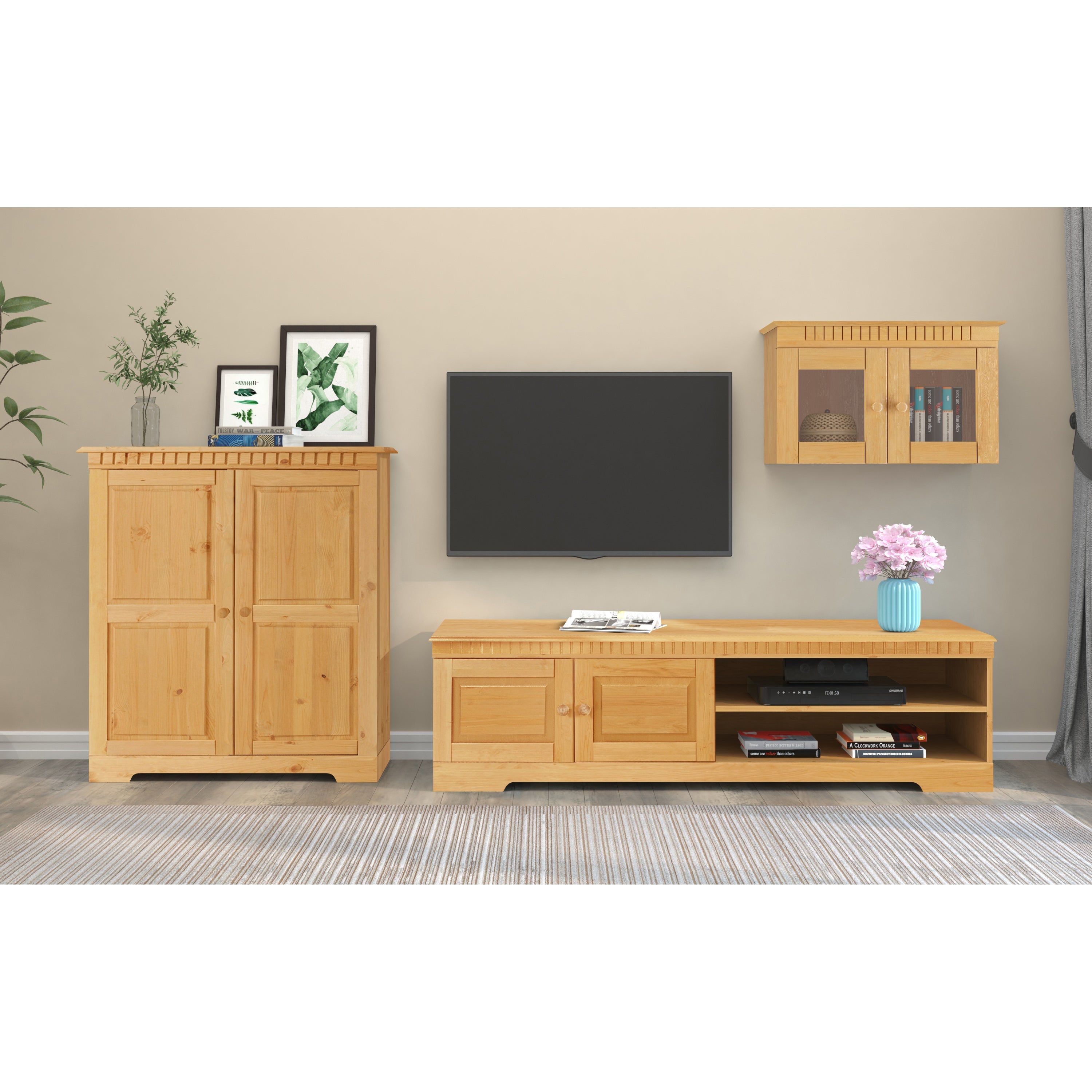 Cubrix Wall Unit 3 Part består af et lowboard, et skab og et hængende vitrineskab, alle lavet af fyrretræ i landlig stil. Vægdelen har et FSC-certifikat, hvilket betyder, at den er lavet af ansvarligt indkøbt træ. Lowboardet har to låger og to åbne hylder til dine medieenheder. Skabet har to låger og to justerbare hylder til dine bøger eller andre ting. Det hængende vitrineskab har to glaslåger til dine billeder eller dekorationer. Cubrix Wall Unit 3 Part er en rummelig og elegant løsning til din stue.