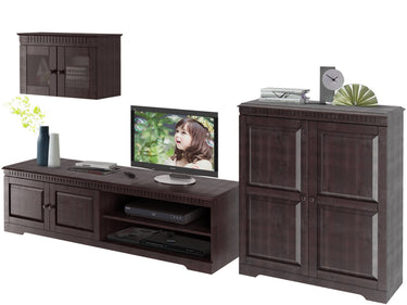 Cubrix Wall Unit 3 Part består af et lowboard, et skab og et hængende vitrineskab, alle lavet af fyrretræ i landlig stil. Vægdelen har et FSC-certifikat, hvilket betyder, at den er lavet af ansvarligt indkøbt træ. Lowboardet har to låger og to åbne hylder til dine medieenheder. Skabet har to låger og to justerbare hylder til dine bøger eller andre ting. Det hængende vitrineskab har to glaslåger til dine billeder eller dekorationer. Cubrix Wall Unit 3 Part er en rummelig og elegant løsning til din stue.