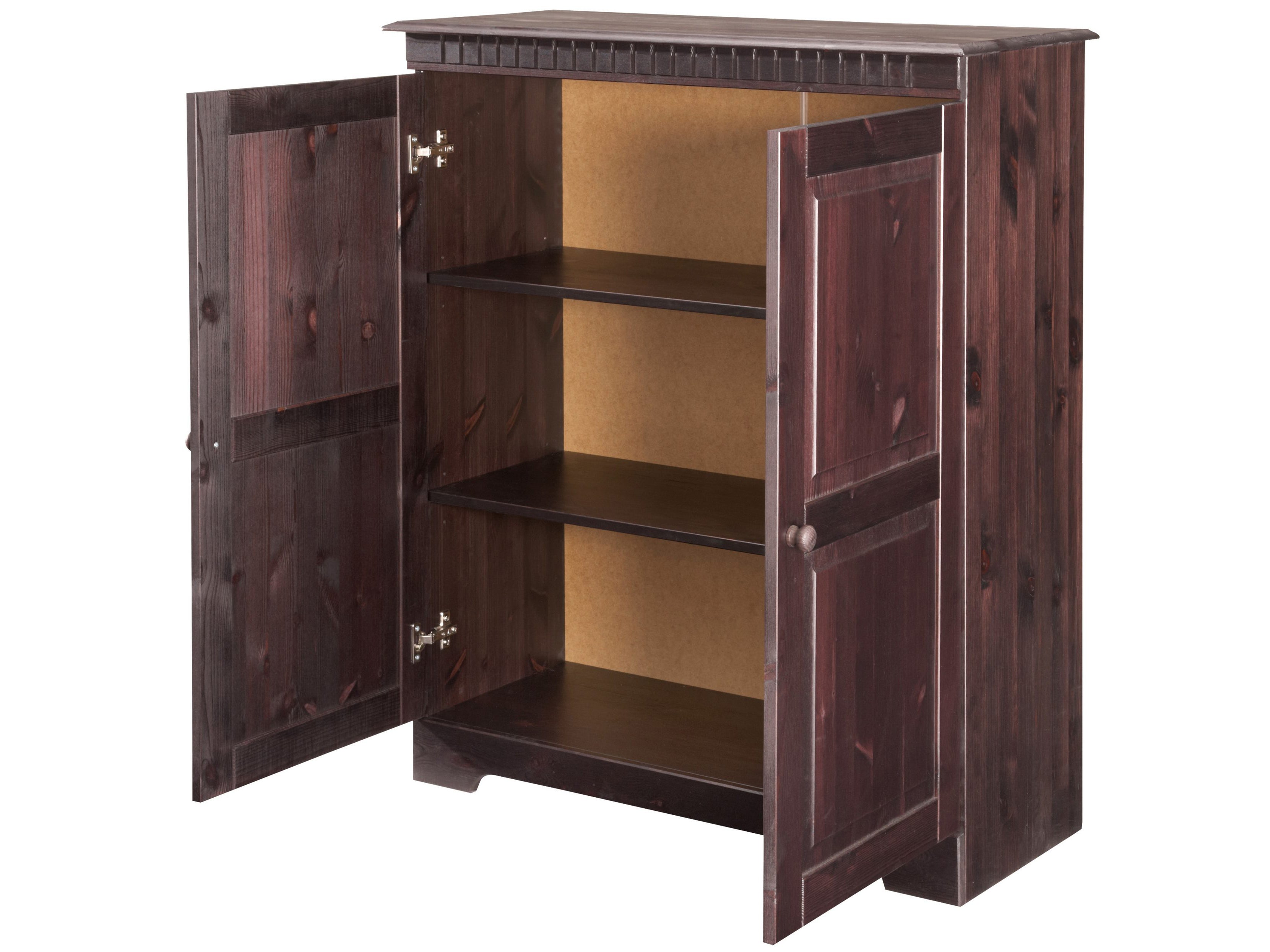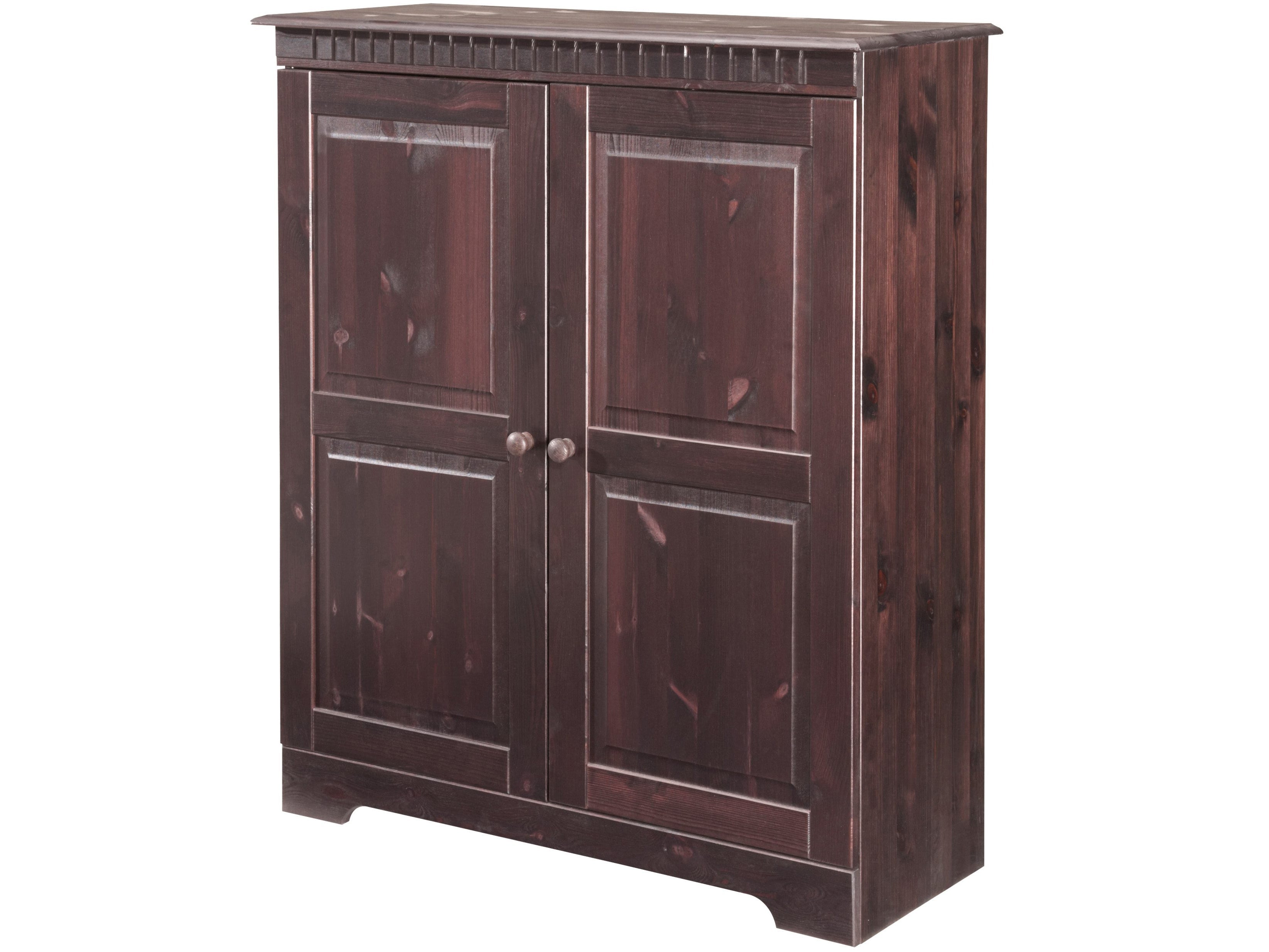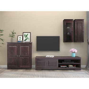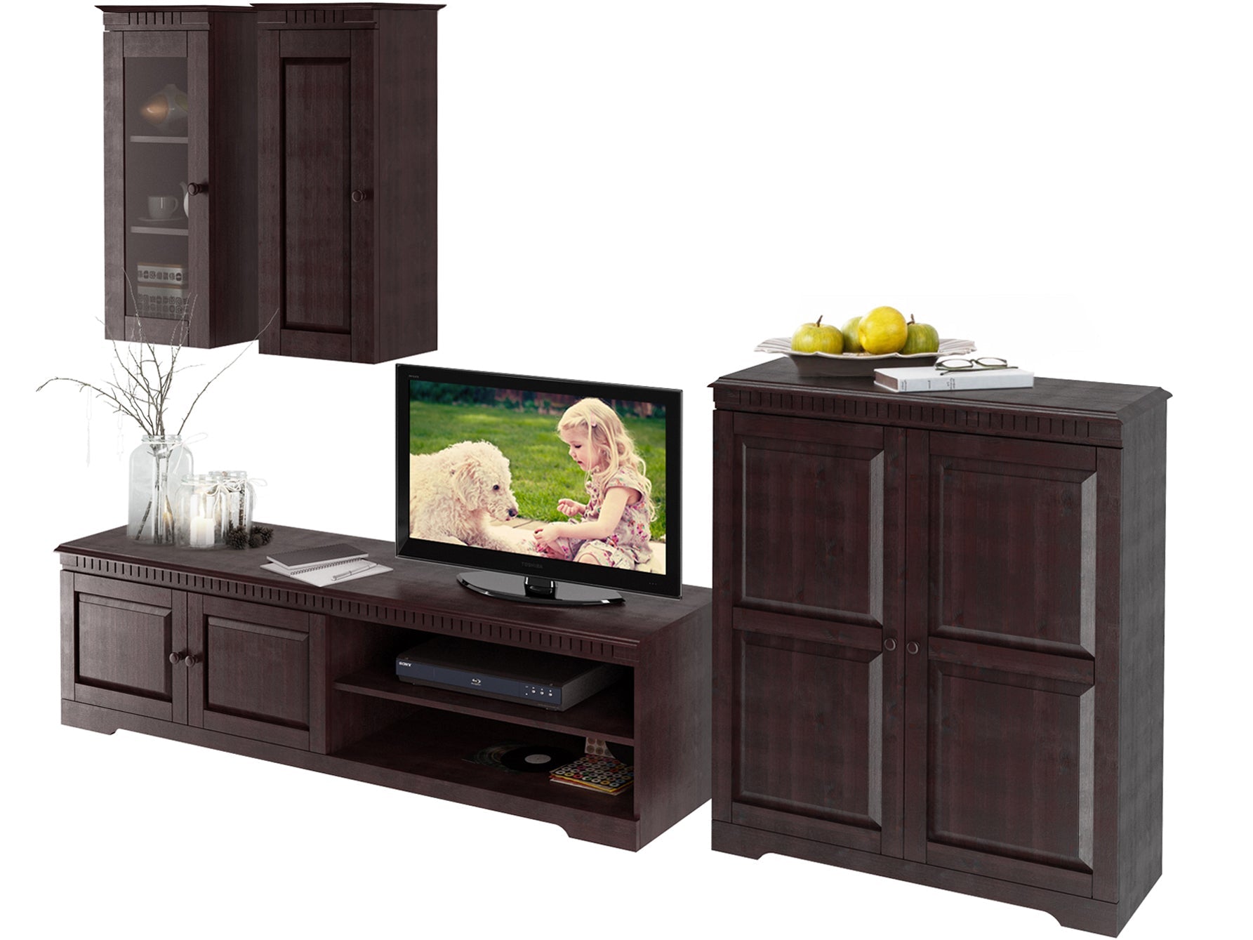 Det enkle og tidløse møbelsæt er lavet af FSC®-certificeret massivt fyrretræ, som kommer fra ansvarligt forvaltede skove og præsenterer sig selv i en hyggelig landlig stil. Synligheden af træstrukturen og knaster er en del af det enkelte møbels individuelle udseende. De dekorative fræsninger ser flotte ud! Stuesættet i 4 dele består af to vægmonterede kabinetter, et tv-lowboard og et midi-skab med masser af opbevaringsplads. Lad træets naturlighed overbevise dig. Fås i forskellige farver.