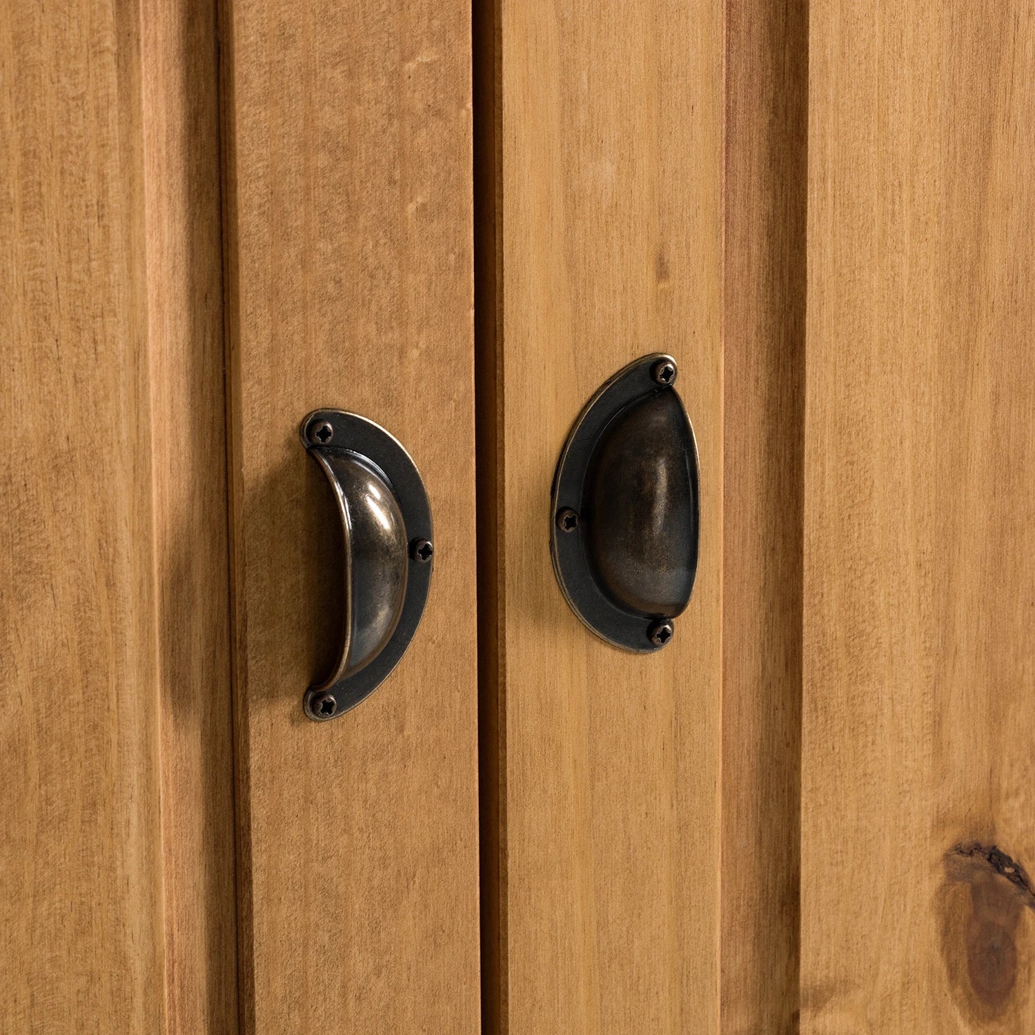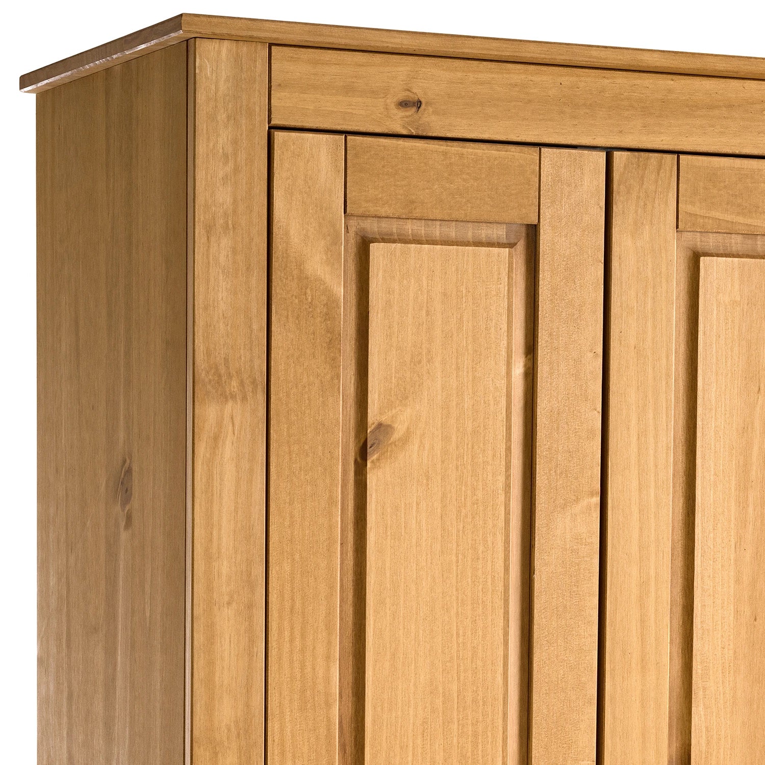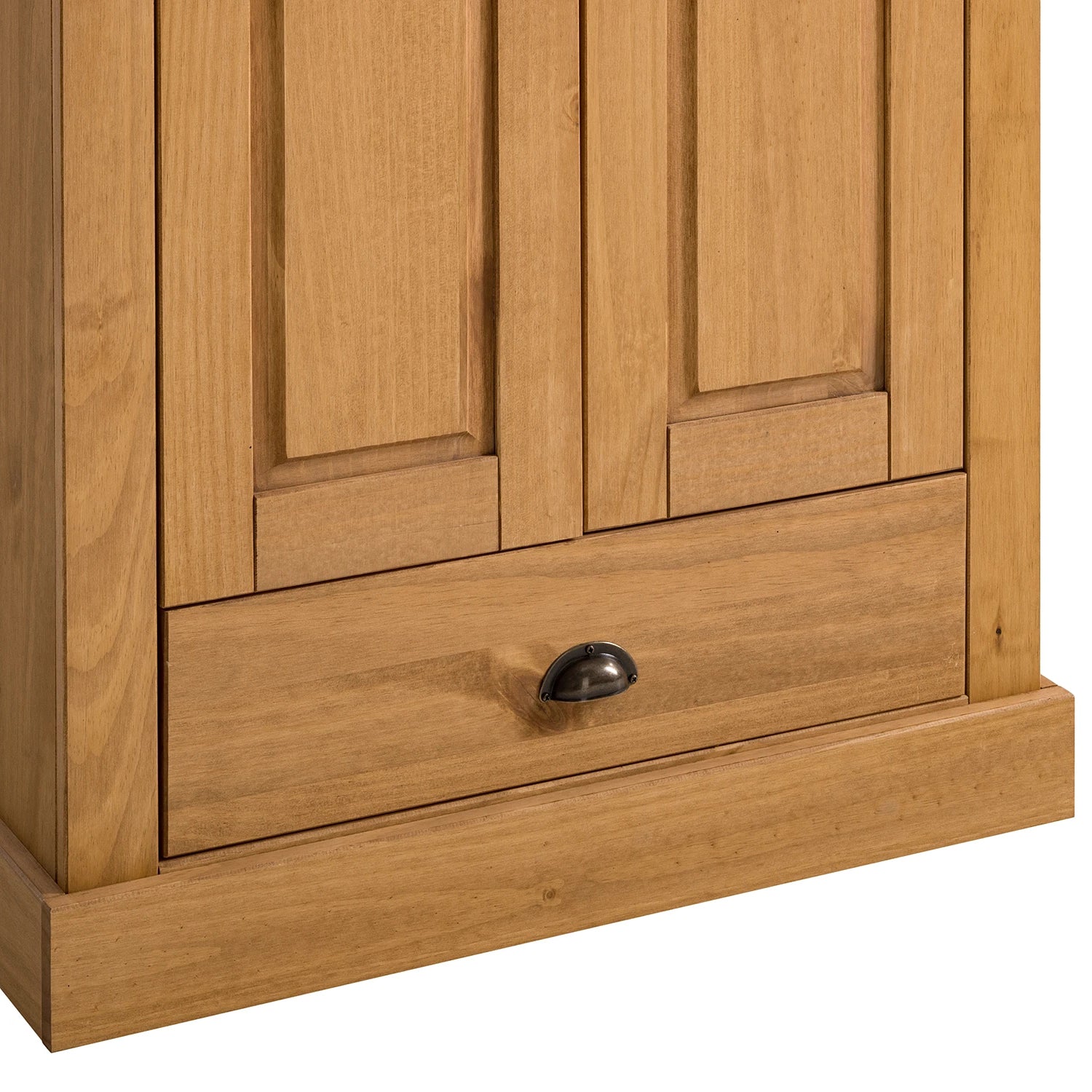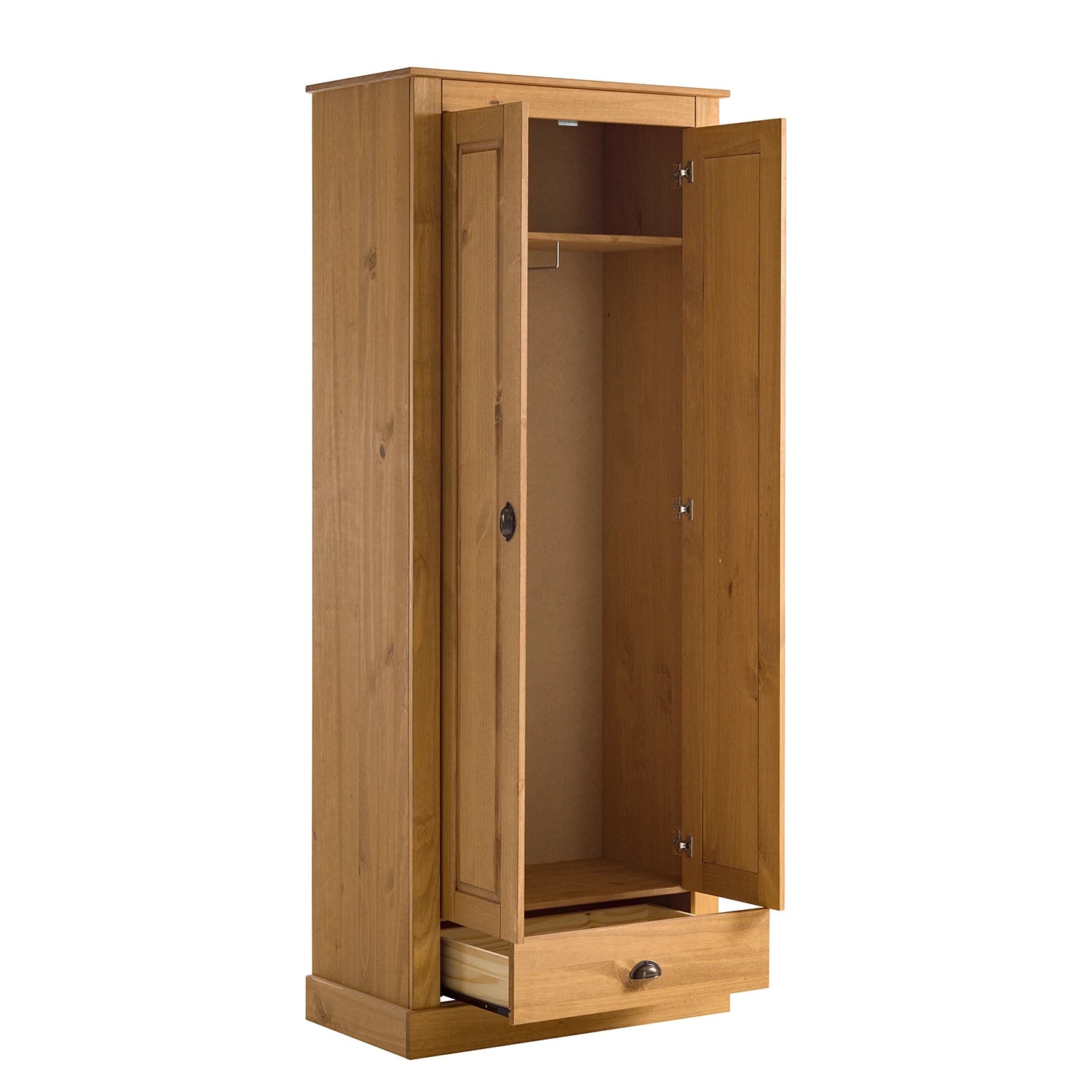 Denne garderobe er lavet af højkvalitets fyrretræ, som giver den både holdbarhed og charme. Garderobeskabet har en skuffe, som tilbyder opbevaring af alt dit tøj og tilbehør. Skuffen er forbedret med et slankt og stilfuldt metallisk håndtag, der komplementerer garderobens naturlige fyrretræfinish.
