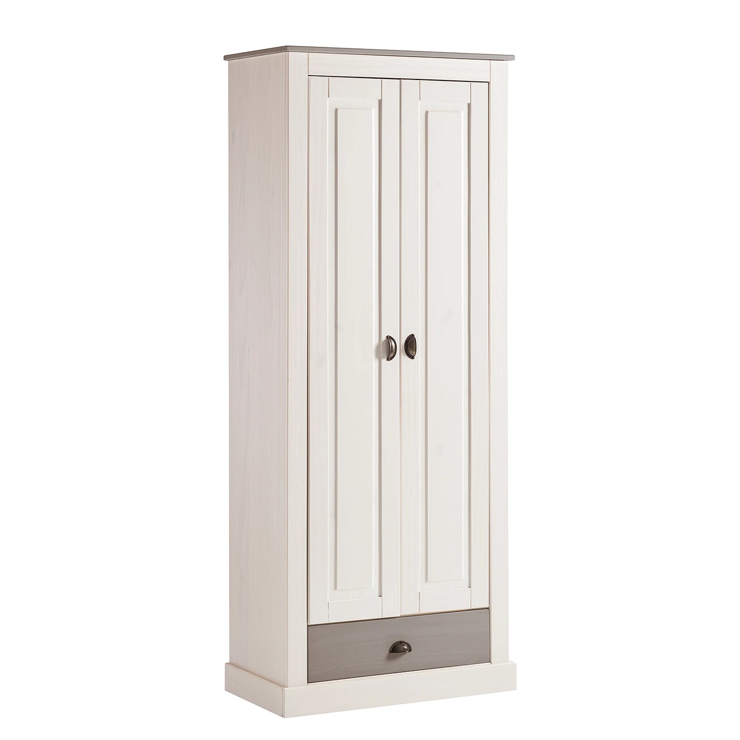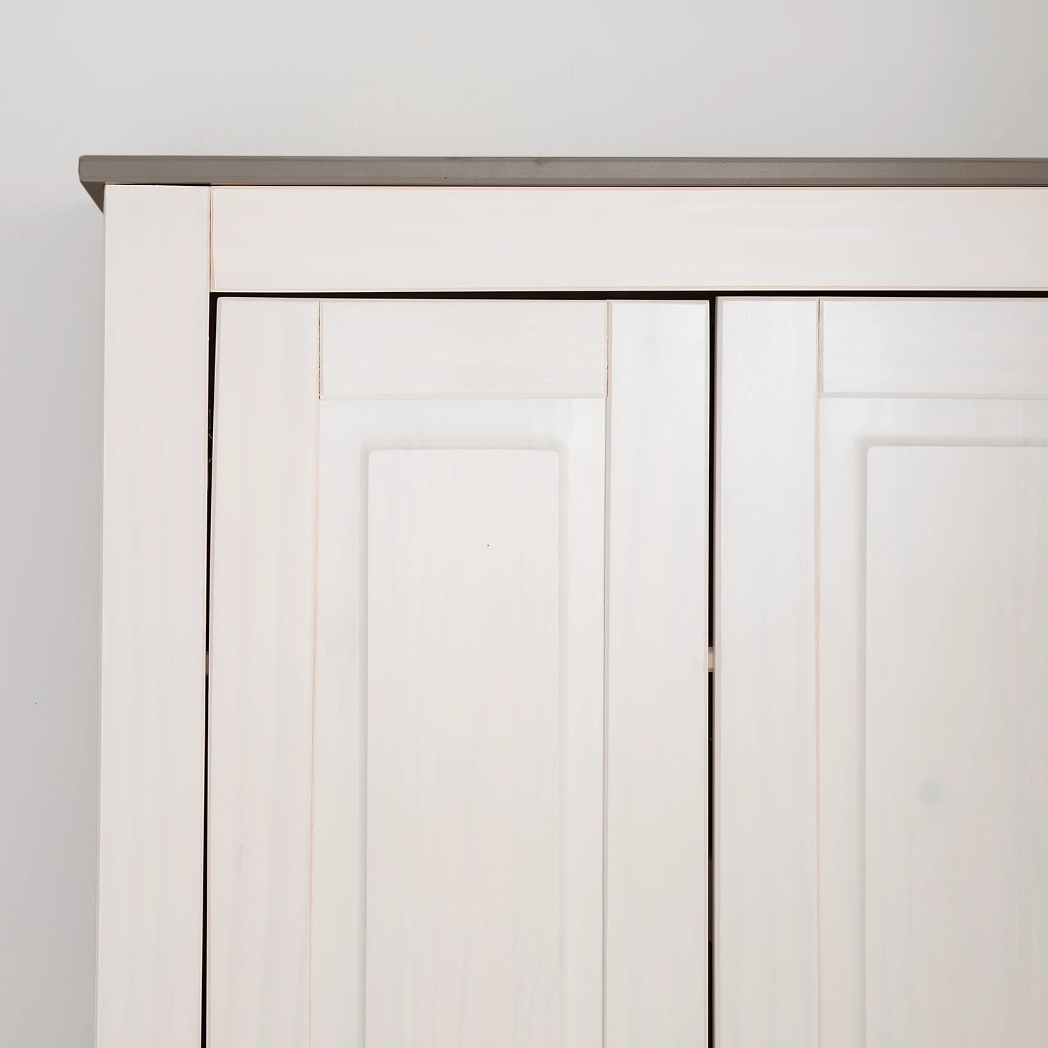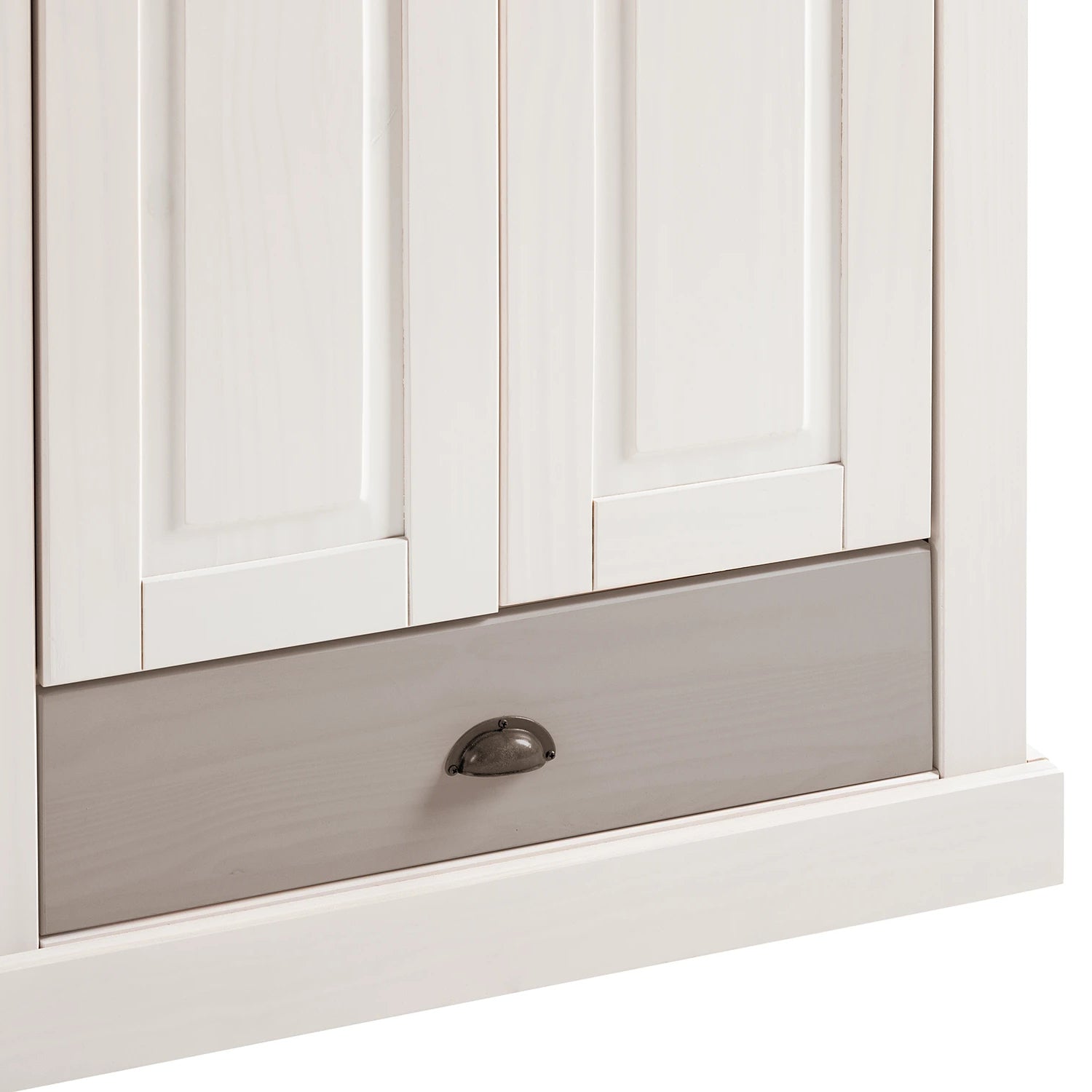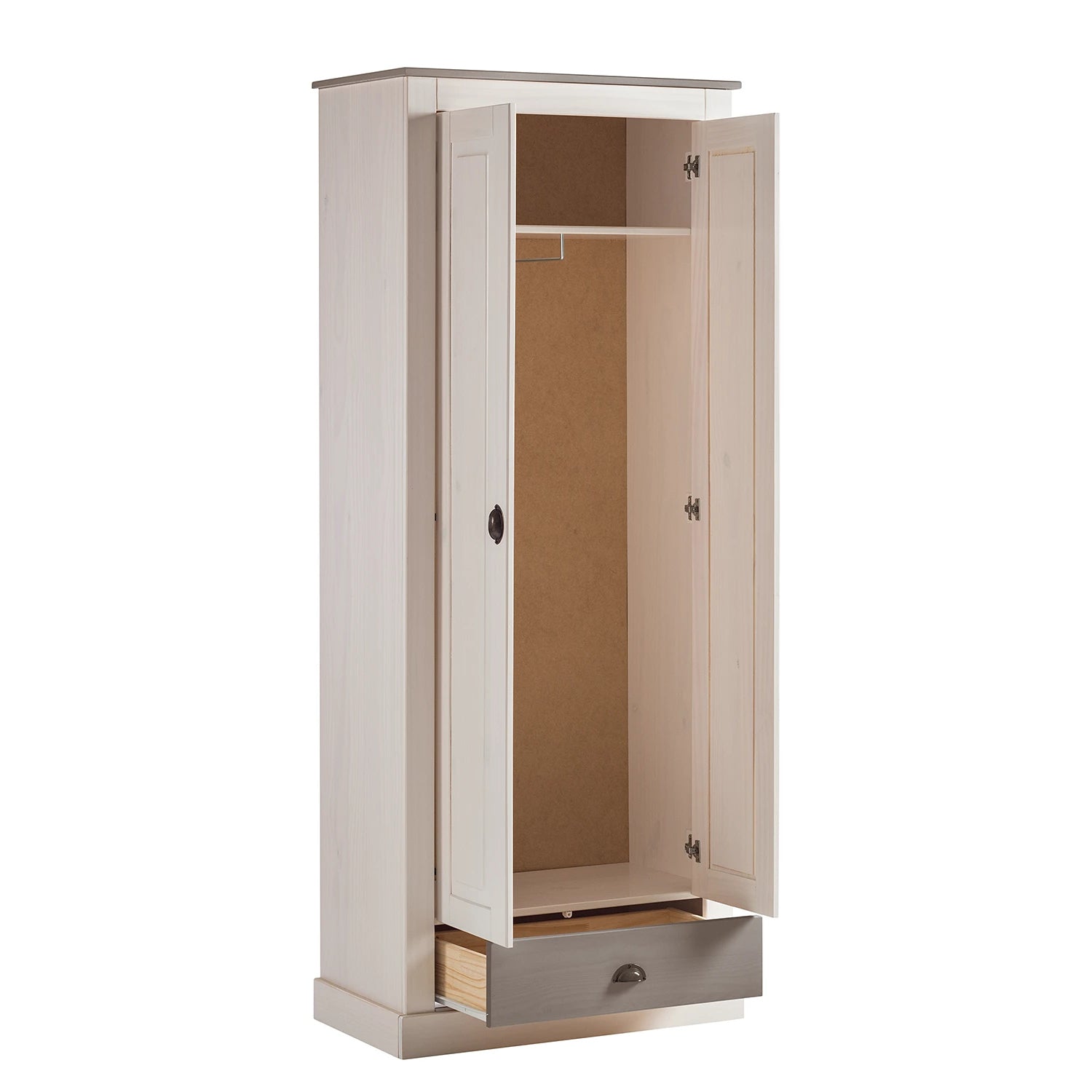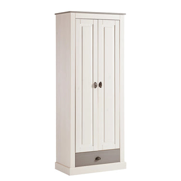 Denne garderobe er lavet af højkvalitets fyrretræ, som giver den både holdbarhed og charme. Garderobeskabet har en skuffe, som tilbyder opbevaring af alt dit tøj og tilbehør. Skuffen er forbedret med et slankt og stilfuldt metallisk håndtag, der komplementerer garderobens naturlige fyrretræfinish.